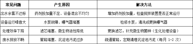 ①.定期檢查:每日查看設備運行狀態(tài),包括水泵、曝氣器、消毒模塊是否正常工作,儀表盤數據是否在標準范圍內;