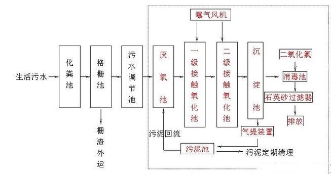 生化池采用生物接觸氧化法,填料的體積負(fù)荷相對較低,微生物處于自身氧化階段,污泥產(chǎn)量小,只需三個多月(90天)就能排出一次污泥(用糞車泵送或脫水成泥餅運輸)。