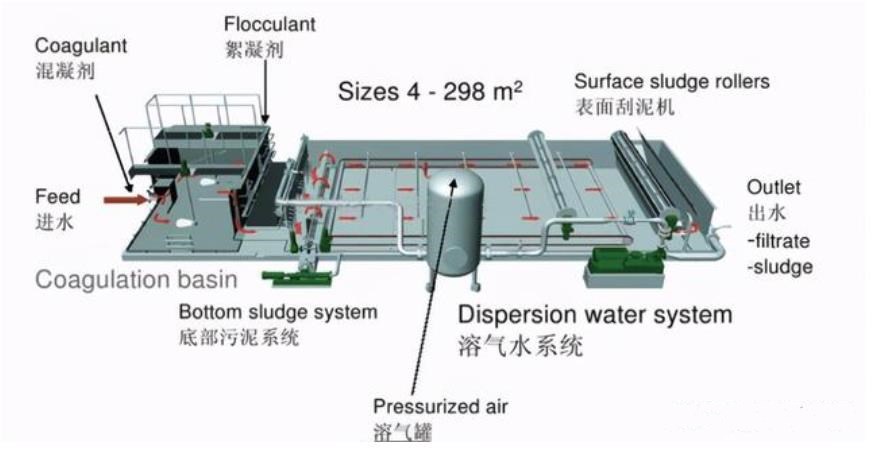 溶解氣浮法采用新型高效溶氣設(shè)備——微泡發(fā)生器,取代傳統(tǒng)的引氣裝置向水中溶氣,在氣浮區(qū)安裝一系列斜管組,包括箱體、刮渣機、螺旋出料機等組成一套完整的氣浮凈水裝置。